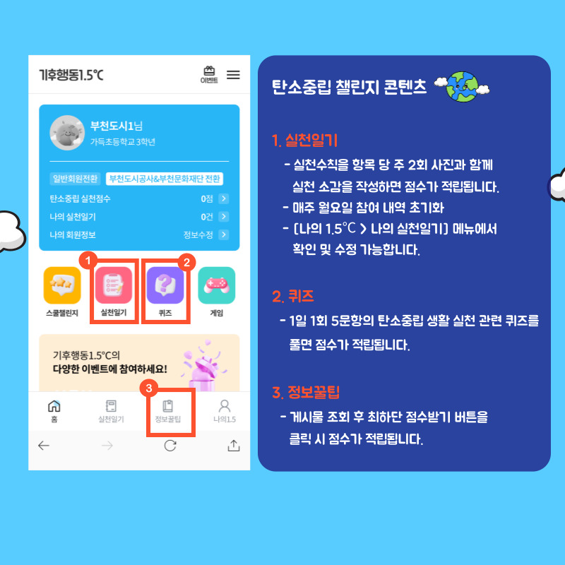 ○ ‘기후행동 1.5℃’(앱/홈페이지) 「부천도시공사&부천문화재단 탄소중립 챌린지」참여 (접속코드 : 0422)