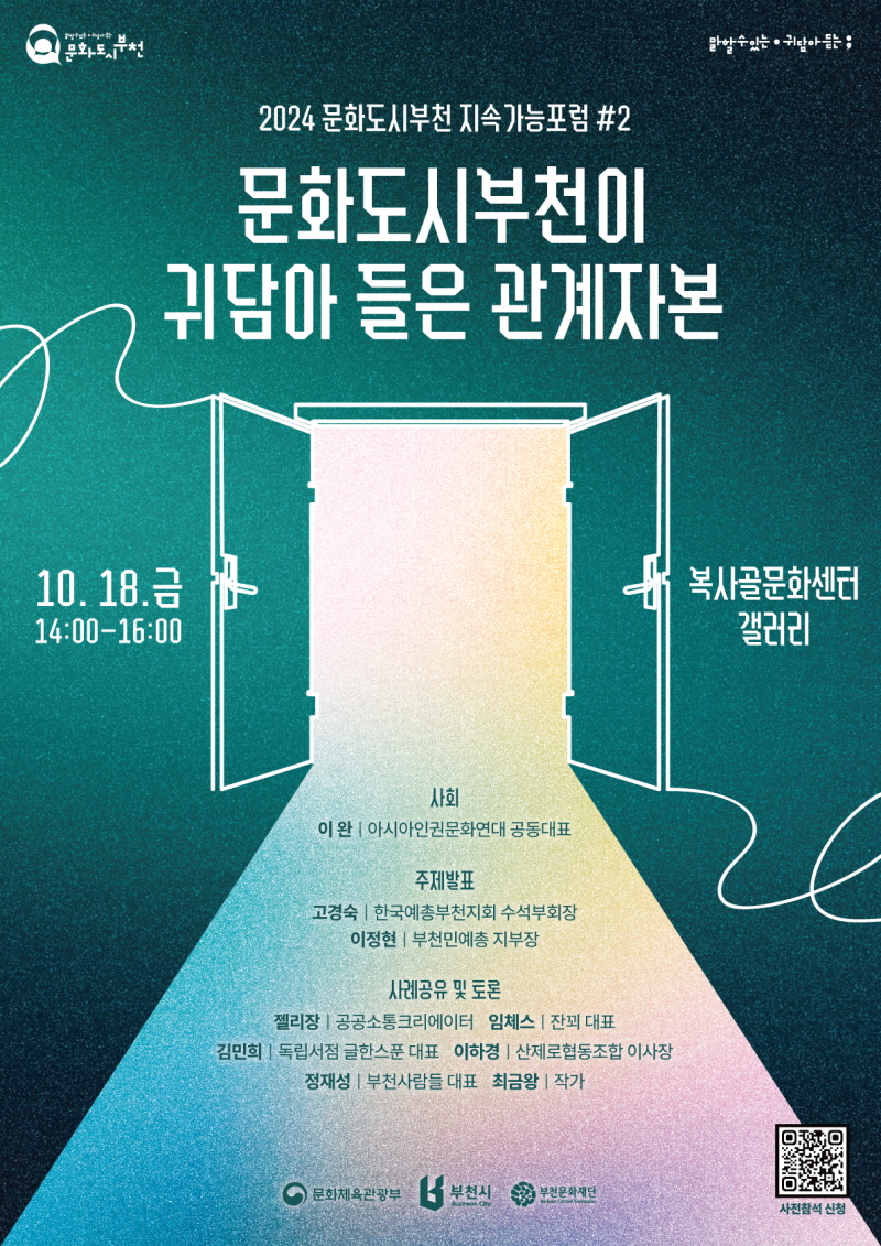 부천문화재단(대표이사 한병환, 이하 재단)은 지난 2일 개최한 ⟪2024 문화도시부천 지속가능포럼⟫의 첫 번째 포럼에 이어, 오는 10월 18일(금) 오후 2시에 복사골문화센터 갤러리에서 ‘문화도시부천이 귀담아 들은 관계자본’을 주제로 두 번째 포럼을 연다.