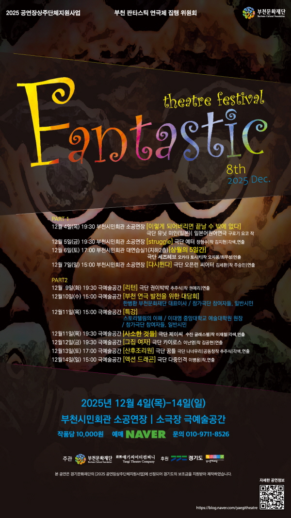 올해로 여덟 번째를 맞은 부천판타스틱연극제에는 국내외 연극단체가 참여해 10일간 다양한 작품을 선보이며, 시민들이 일상 속에서 연극의 매력을 깊이 있게 경험할 수 있도록 한다. 특히 10일 오후 3시에는 극단 참여자들과 일반 시민이 함께하는 ‘부천 연극 발전을 위한 대담회’를 열어 부천 연극계의 현안과 미래 방향을 함께 논의하는 자리를 마련한다.