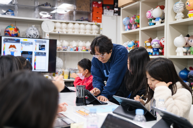 ▲ ‘2025 꿈의 스튜디오’ 시범 운영사업에서 임덕영 작가와 청소년들이 웹툰 수업을 진행하고 있다.