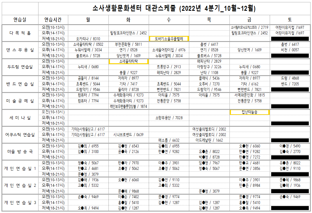 - 다목적홀과 댄스무용실은 10월 1일 (토)부터 ~ 10월 8일 (토)까지는