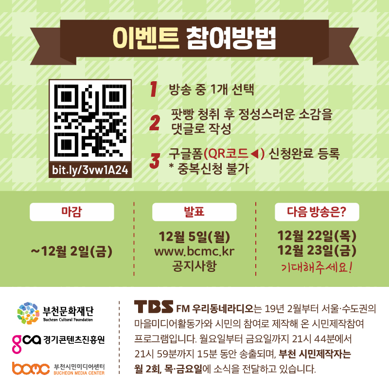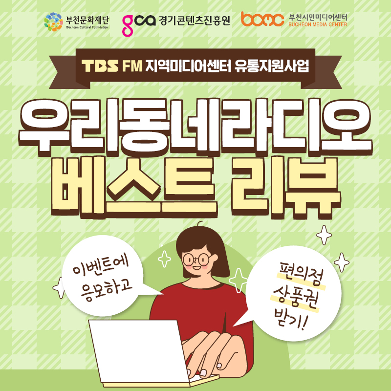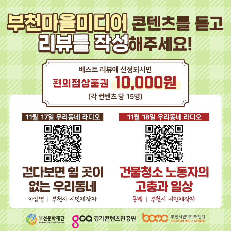 아래 해당하는 부천마을미디어 콘텐츠를 듣고 베스트 리뷰를 작성해주신 분께