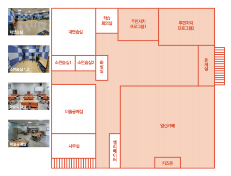 ▶ 도당예술마당 : 대연습실 / 학습회의실 / 미술공예실 / 소연습실1 / 소연습실2