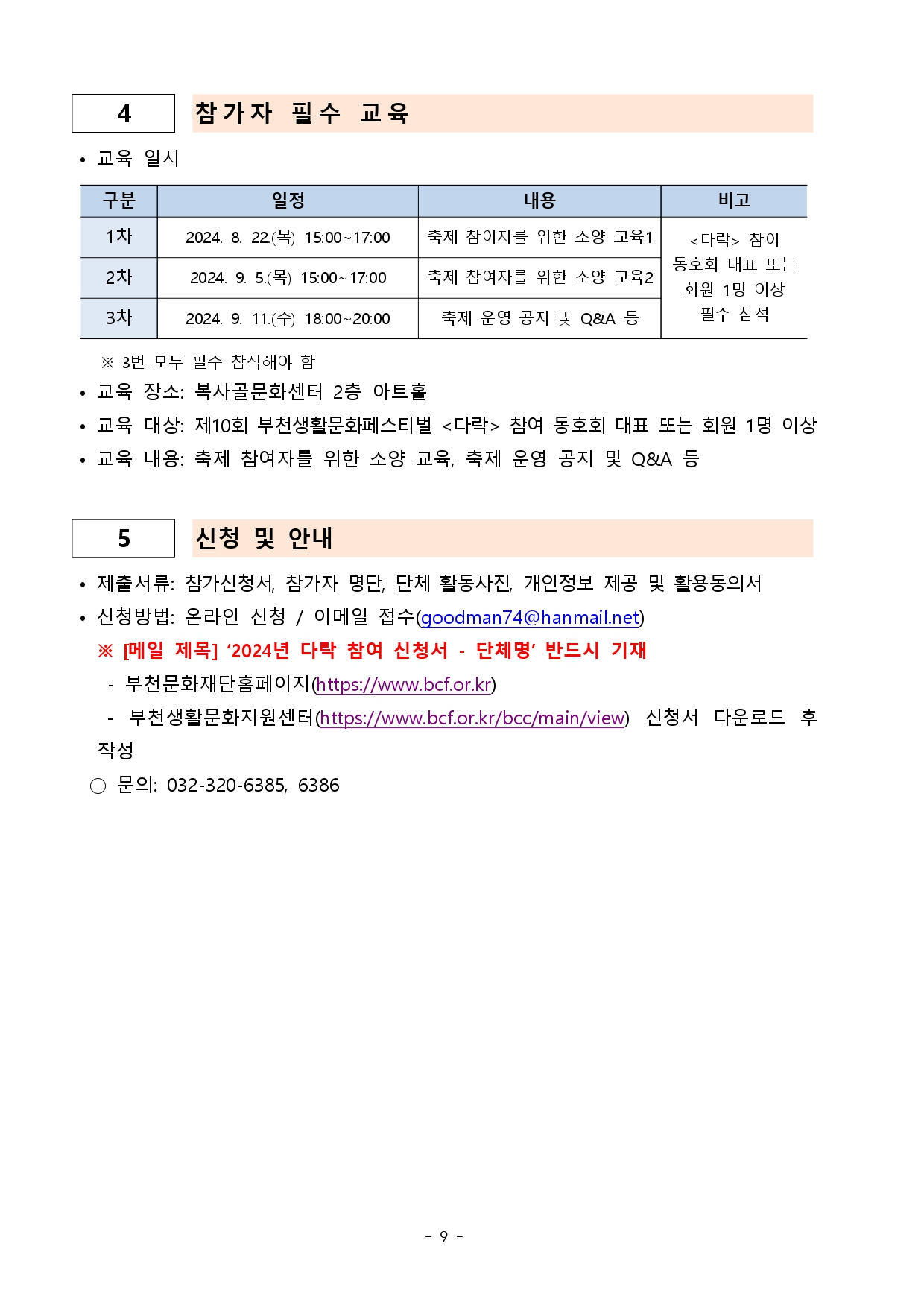 | 2차 | 2024. 9. 5.(목) 15:00~17:00 | 축제 참여자를 위한 소양 교육2 | |