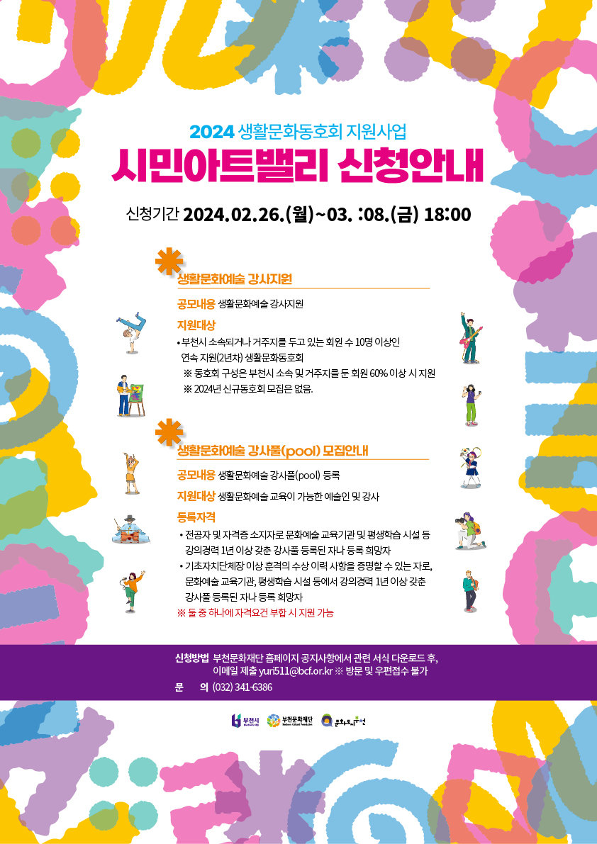 부천문화재단(이하 재단)은 3월 8일(금)까지 생활문화동호회 ‘시민아트밸리’ 참여자를 모집한다. ‘시민아트밸리’는 입문 단계의 생활문화동호회에 전문 강사를 지원해 누구나 생활문화예술을 배우고 즐길 수 있도록 해마다 운영하는 사업이다.