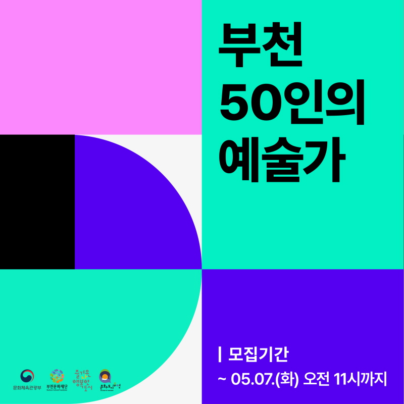 부천문화재단(이하 재단)은 5월 7일(화) 오전 11시까지 예술 산업화 기반을 마련하기 위해 ‘부천 50인의 예술가를 모집한다. ’부천 50인의 예술가‘는 기업과 콜라보하여 작품을 창작하고, 예술 유통을 위한 다양한 판로 개척에 함께한다.