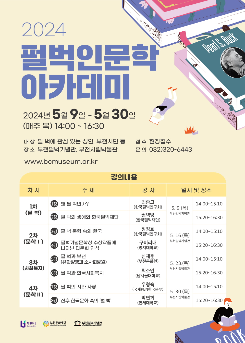 부천문화재단에서 운영하는 부천펄벅기념관에서 오는 5월 9일(목)부터 30일(목)까지 ‘2024 펄벅인문학아카데미’를 개최한다.