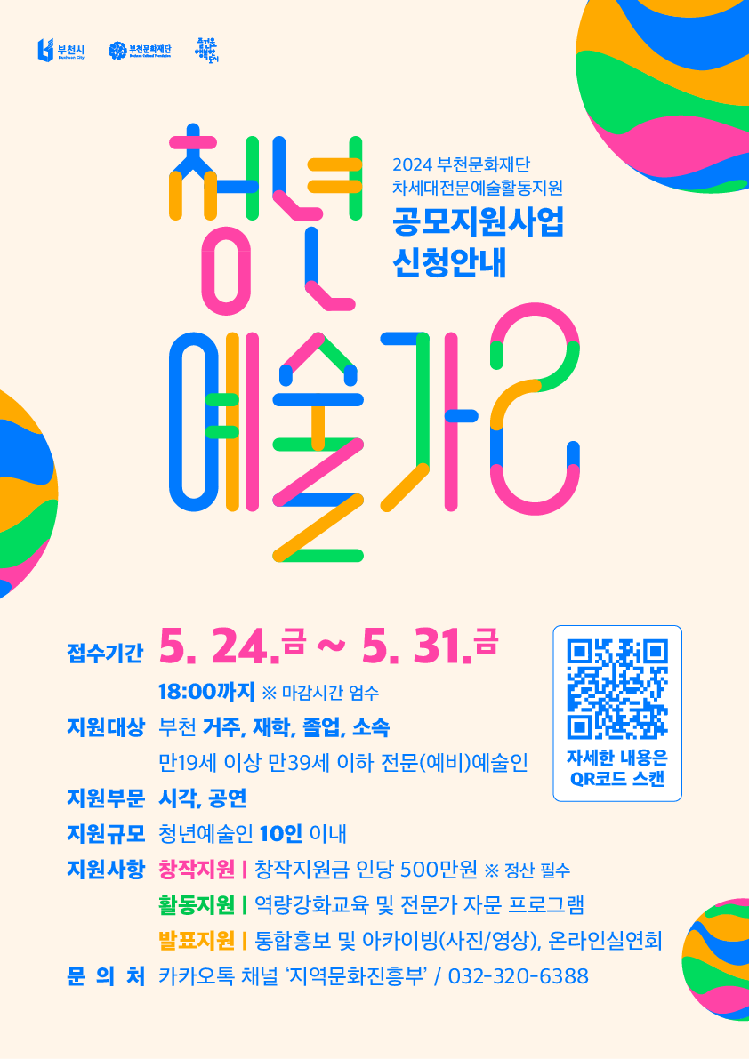 접수 기간은 오는 5월 24일(금)부터 5월 31일(금) 18시까지이며, 공모 지원을 원하는 청년예술가는 부천문화재단 누리집(www.bcf.or.kr) 공지 사항에서 공고문 확인 후, 지원 서식을 내려받아 이메일로 접수할 수 있다.