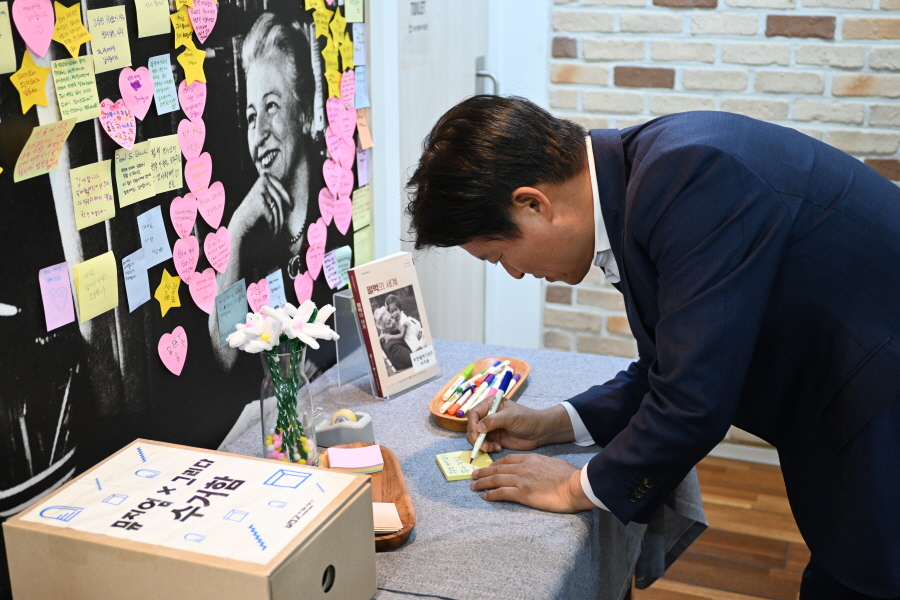 ▲(사진1) 조용익 부천시장이 부천펄벅기념관에 방문해 펄 벅 추모 메시지를 작성하고 있다.