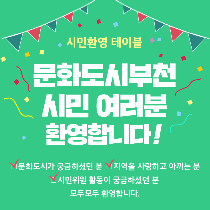 또한 문화도시 사업과 시민위원 활동이 궁금했던 시민들을 위해 시민위원 가입 방법과 문화도시 부천 온라인 플랫폼인 도시플랫폼B 이용 방법 등을 자세히 안내할 예정이다.
