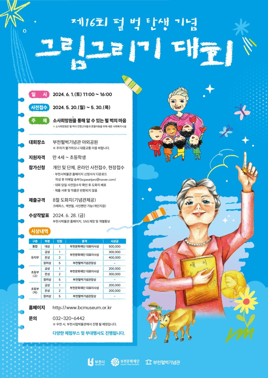 참가 대상은 전국 만4세~초등학생까지이다. 참여를 희망하는 이는 5월 30일(월)까지 박물관 누리집(www.bcmuseum.or.kr)에서 참가신청서를 내려받아 작성한 뒤 전자우편(bcpearlpro@naver.com)으로 보내면 되고 대회 당일 현장에서도 접수할 수 있다. 이번 그림 주제는 소사희망원을 통해 알 수 있는 펄 벅의 마음으로 ▲친구를 사랑하는 마음 ▲사회적 약자를 보호하는 마음 ▲다문화를 존중하는 마음 ▲누구나 차별받지 않는 마음 ▲사람의 권리를 존중하는 마음 등이다.