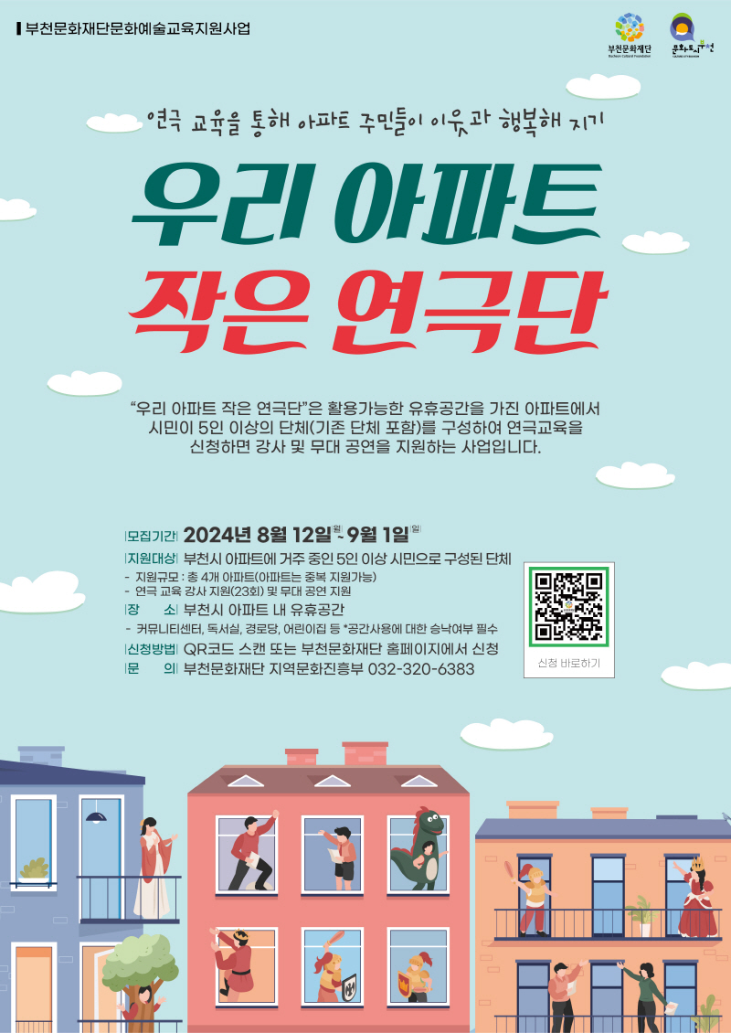 부천문화재단(대표이사 한병환, 이하 재단)은 9월 1일까지 ‘우리 아파트 작은 연극단’에 참여할 단체를 모집한다.