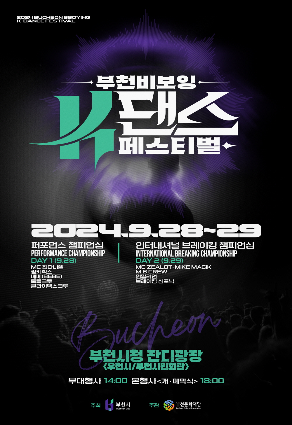 ‘세계 비보이와 함께하는 <2024 부천 비보잉 & K-댄스 페스티벌>’은 부천시 대표 축제로 오는 9월 28일과 29일 양일간 부천시청 잔디광장 및 차 없는 거리에서 개최된다. 비보잉과 K-댄스를 사랑하는 사람이면 누구나 무료로 관람할 수 있다. 9월 28일에는 퍼포먼스 챔피언십이 진행되며, 29일에는 인터내셔널 브레이킹 챔피언십이 펼쳐진다.