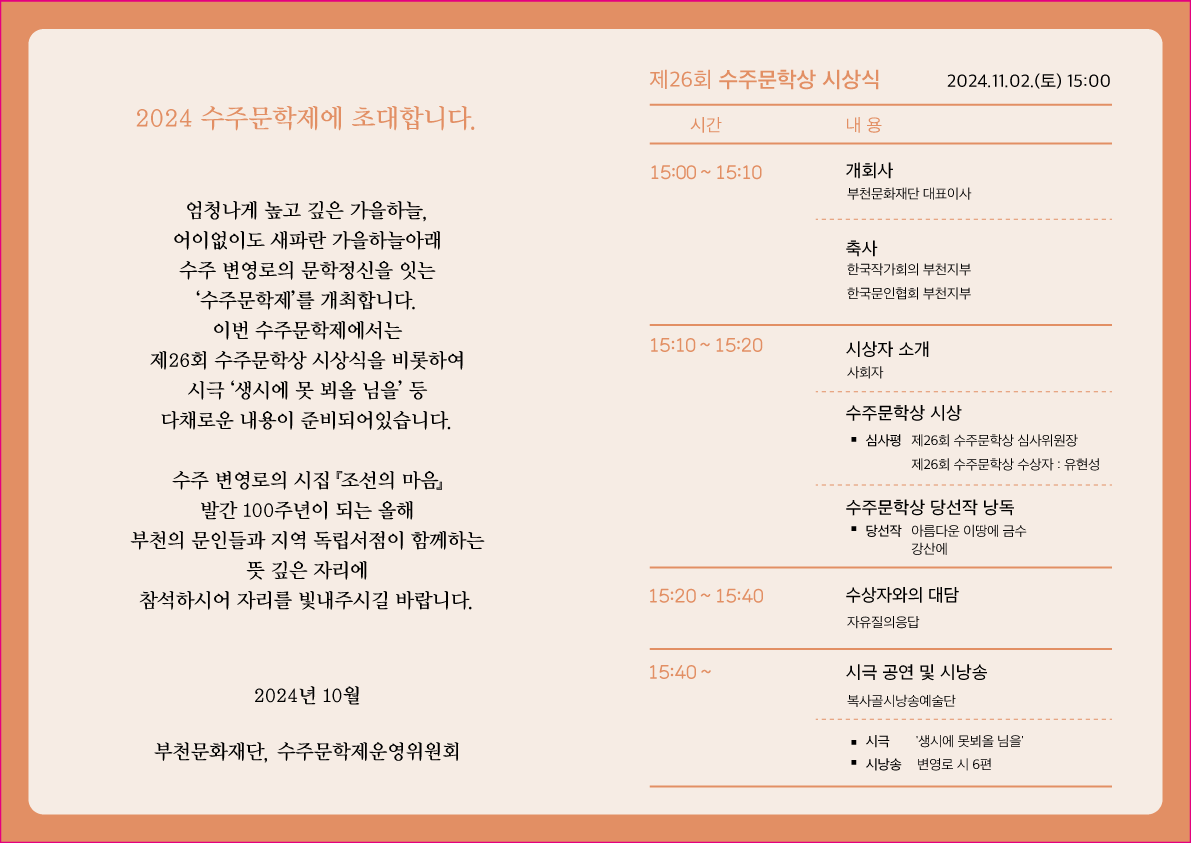 2일 토요일에는 ‘제26회 수주문학상 시상식’ 및 복사골시낭송예술단의 축하공연 시극 ‘생시에 못뵈올 님을’, 수주문학상 수상자와의 대화 등 다양한 프로그램이 준비되어 있다.