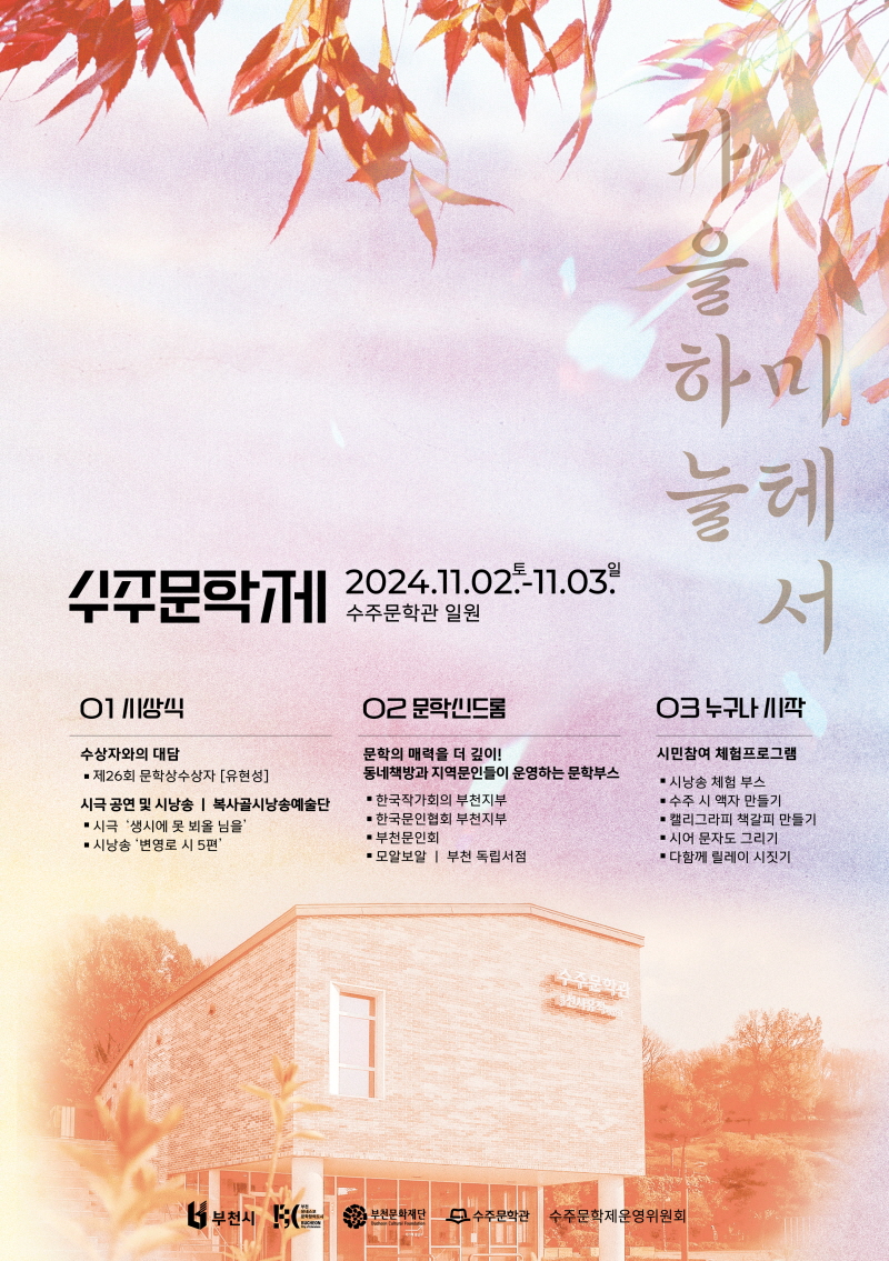 부천문화재단(대표이사 한병환)이 운영하는 수주문학관은 오는 11월 2일과 3일 양일간 <2024 수주문학제>를 개최한다. 이번 행사는 수주문학상 시상식, 공연, 체험프로그램 등 다양한 활동으로 구성되어 있다.