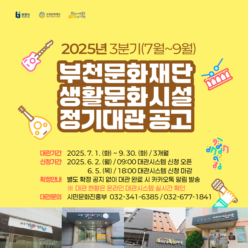부천문화재단(대표이사 한병환)은 생활문화동호회와 개인의 문화예술 활동을 지원하기 위해 2025년 3분기(7~9월) 생활문화시설 정기대관 신청을 받는다.
