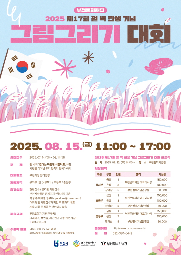 참가 신청은 개인 및 단체 모두 가능하며, 7월 14일(월)부터 8월 11일(월)까지 부천시박물관 누리집에서 신청서를 내려받아 이메일(bcpearlpro@naver.com)로 제출하면 된다. 대회 당일 현장 접수도 가능해 더 많은 아동·청소년이 참여할 수 있도록 했다. 행사 현장에서는 그림그리기 대회 외에도 어린이들이 즐길 수 있는 다양한 체험 부스가 운영될 예정이다.