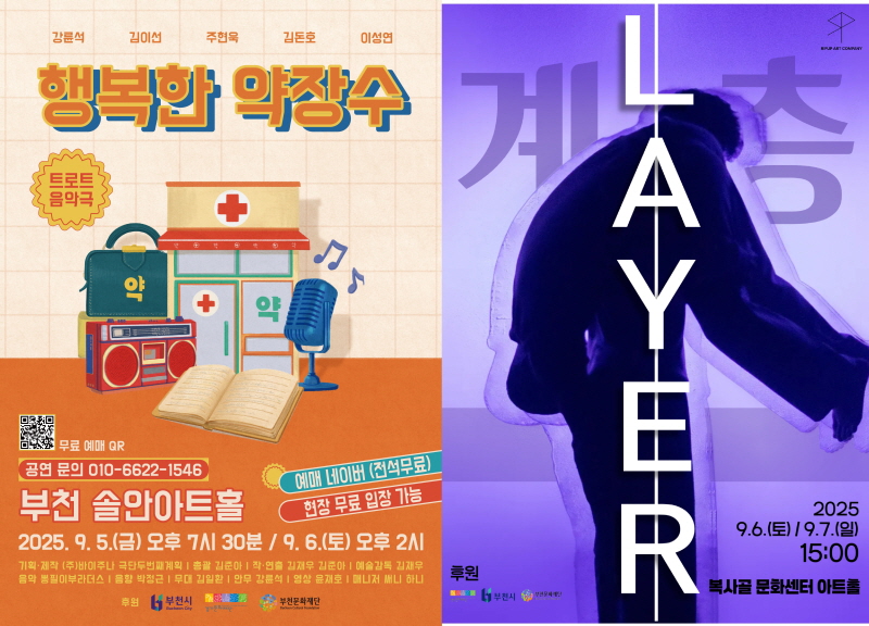 지난 8월 전시프로그램으로 부천의 문화예술을 풍성하게 한 데 이어, 다가오는 9월에는 이야기가 있는 세 편의 공연이 무대에 오른다. ▲(주)바이주나의 공연 시니어를 위한 음악극<행복한 약장수>(9월 5일~6일, 솔안아트홀) ▲한기태의 공연 <계층:Layer>(9월 6~7일, 복사골문화센터 아트홀) ▲복사골시낭송예술협회의 공연<시(詩)를 품고 사는 사람들>(9월 28일, 부천시민회관 소공연장)이 차례로 막을 올린다.