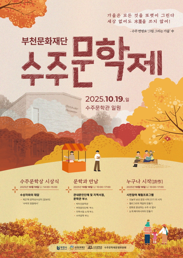 부천문화재단(대표이사 한병환, 이하 재단)이 운영하는 수주문학관은 오는 10월 19일(일) <2025 수주문학제 ‘시 그리는 가을’>을 개최한다. 이번 행사는 수주문학상 시상식, 홍보 부스, 체험 프로그램 등 다양한 활동을 해 시민들이 즐길 수 있다.