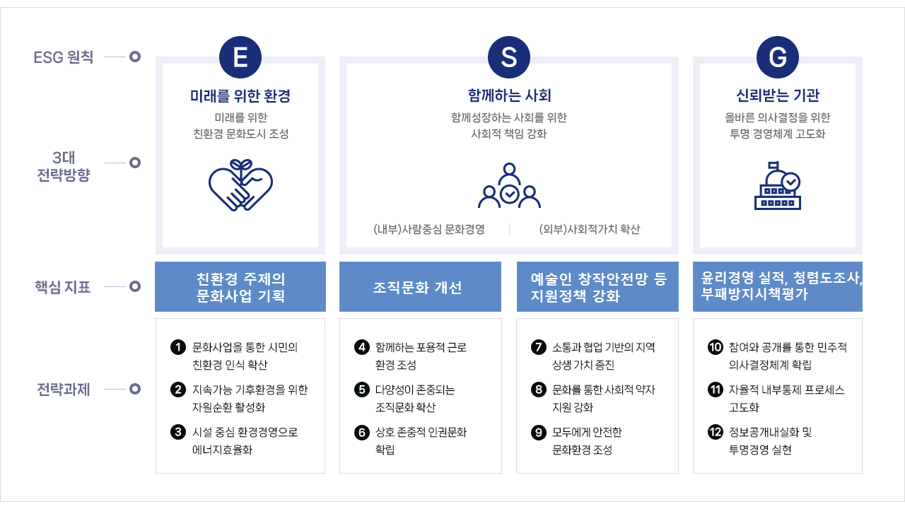 | 핵심 지표 | 친환경 주제의 문화사업 기획 | 조직문화 개선 예술인 창작안전망 등 지원정책 강화 | 윤리경영 실적, 청렴도조사, 부패방지시책평가 | |