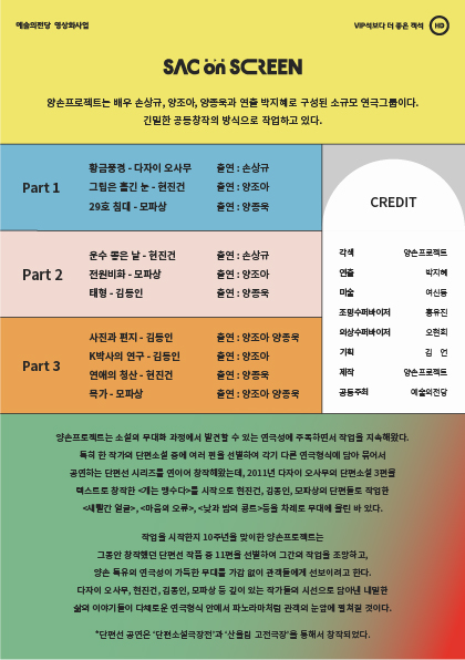 예술의전당 영상화사업 / VIP석보다 더 좋은 객석 HD / yang  SON / 영상으로 만나는 연극 / 양손프로젝트 단편선 레파토리 展 / WWW.SAC.OR.KR/SACONSCREEN /예술의전당이 선별한 우수한 공연의 영상화 / 전국 어디에서나 스크린으로 만날 수 있는 예술의전당 콘텐츠 / SAC on SCREEN 양손프로젝트 단편선 레파토리展 / 예술의전당