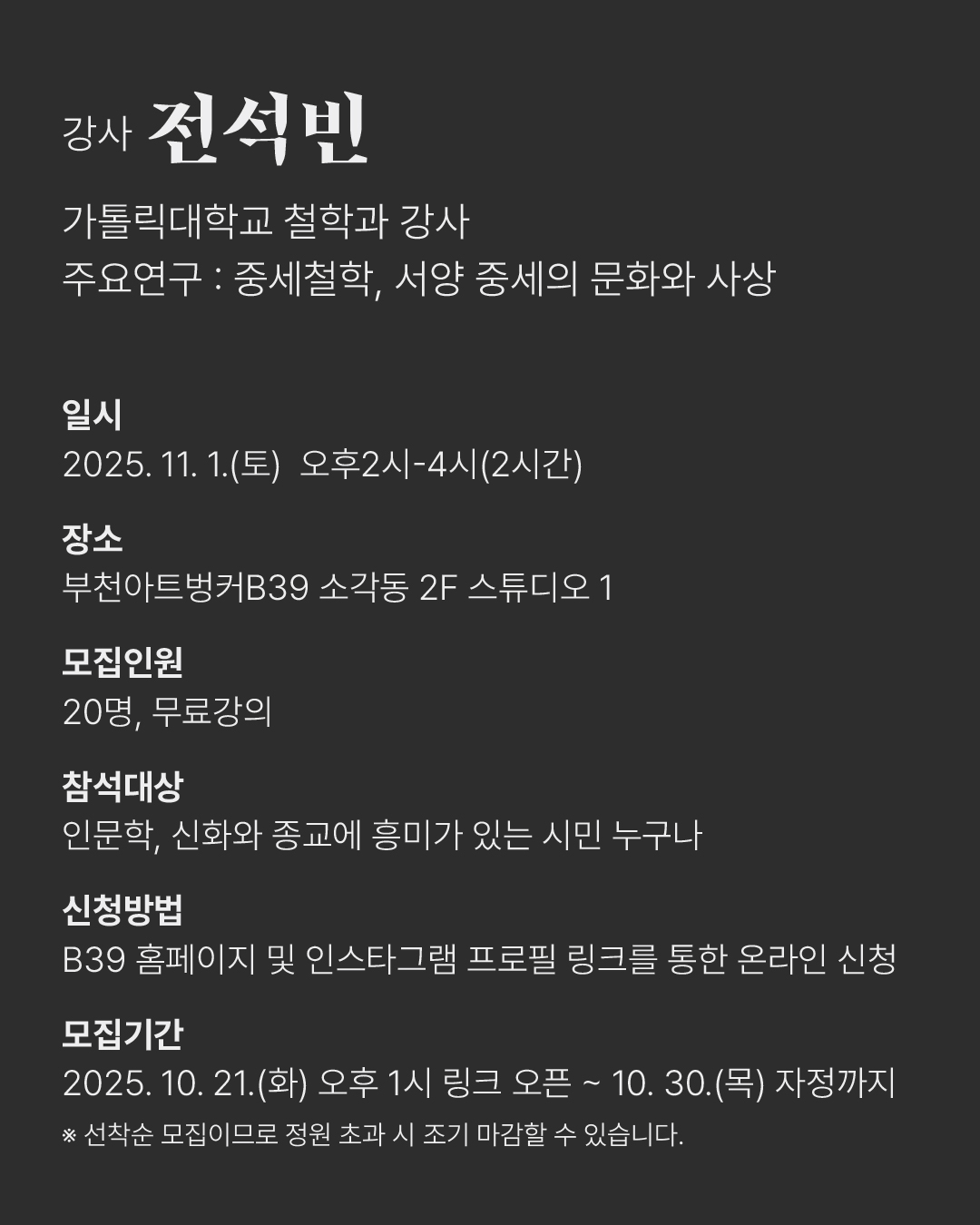 부천아트벙커B39에서 특강과 함께 전시를 관람하시며 풍부한 예술적 경험을 누리시기 바랍니다.